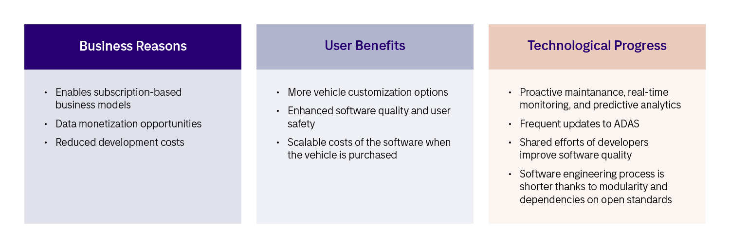 Although the definitions may vary, the one common ground is that SDV inevitably involves the decoupling of hardware and software (HW/SW). Ultimately, the concept of SDV has a range of universal characteristics, such as: