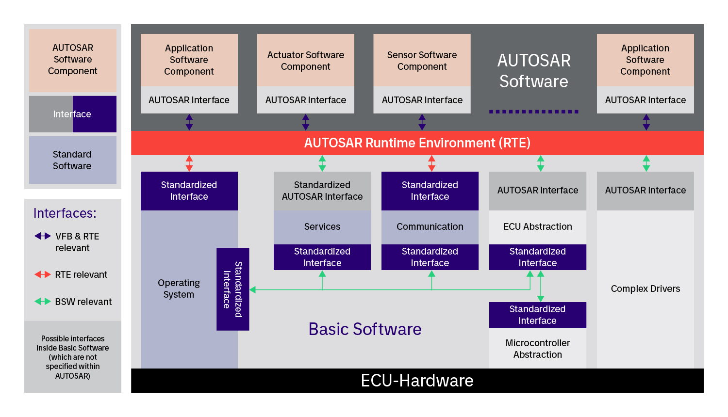 AUTOSAR was the first to provide a standardized solution for decoupling hardware and software by establishing the AUTOSAR classic platform, which differentiates three core software layers that run on a microcontroller application, runtime environment, and basic software (BSW). In its turn, BSW is broken down into three major layers – Service layer, ECU abstraction, and Microcontroller abstraction. In addition, there is a Complex Drivers layer that provides faster access to the capabilities of the microcontroller.